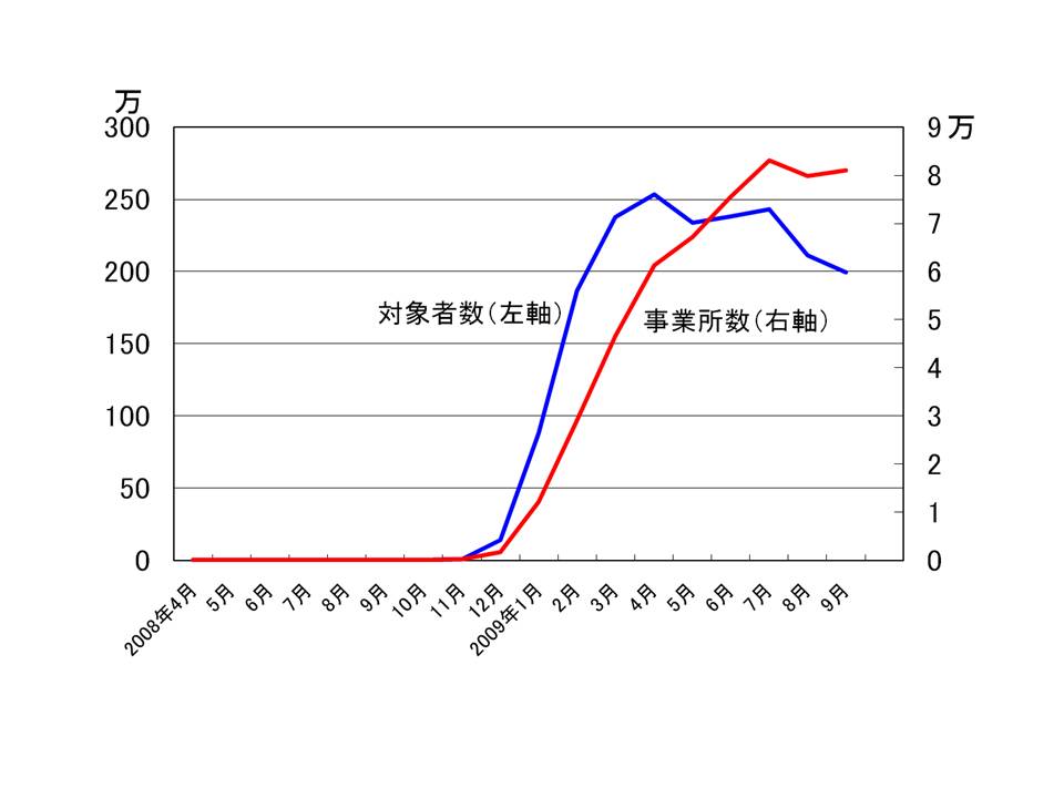 雇用調整助成金(業績の悪化した企業が休職中の労働者に出す休業手当の一部を政府が補助する制度)の支給が、昨年秋に厚労省が方針転換したため激増し、図のように昨年9月には約2000人だった対象者が、1年で約200万人と1000倍になった。厚労省は、民主党政権の方針を受けてこの支給対象をさらに広げる方針だ。