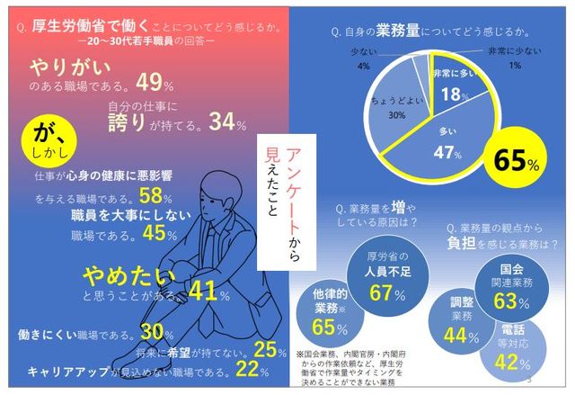 そこには「厚生労働省に入省して、生きながら人生の墓場に入ったとずっと思っている」といった過酷な労働実態への悲鳴が並び、その大きな原因として「国会関連業務」があげられている。今や「モンスタークレーマー」になった野党への対応が、若手官僚の大きな負担になっていることがわかる。