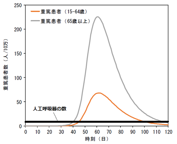 基本再生産数Ro=2.5の場合の重篤患者数(専門家会議の資料より)