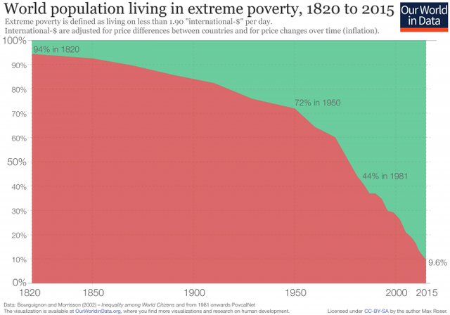 1日1.9ドル以下の所得で暮らす貧困層の比率は、産業革命の前には94%だったが、今は10%以下になっている。
