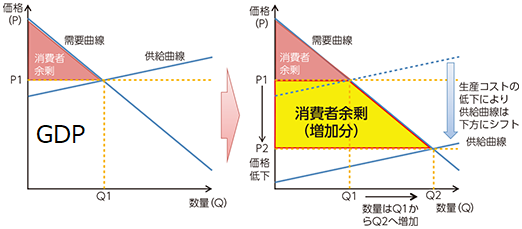脱物質化でGDPベースの成長率が下がることも避けられないが、それが人々を不幸にするとは限らない。次の図のように生産コスト(GDP)が下がると消費者余剰は増えるからだ。